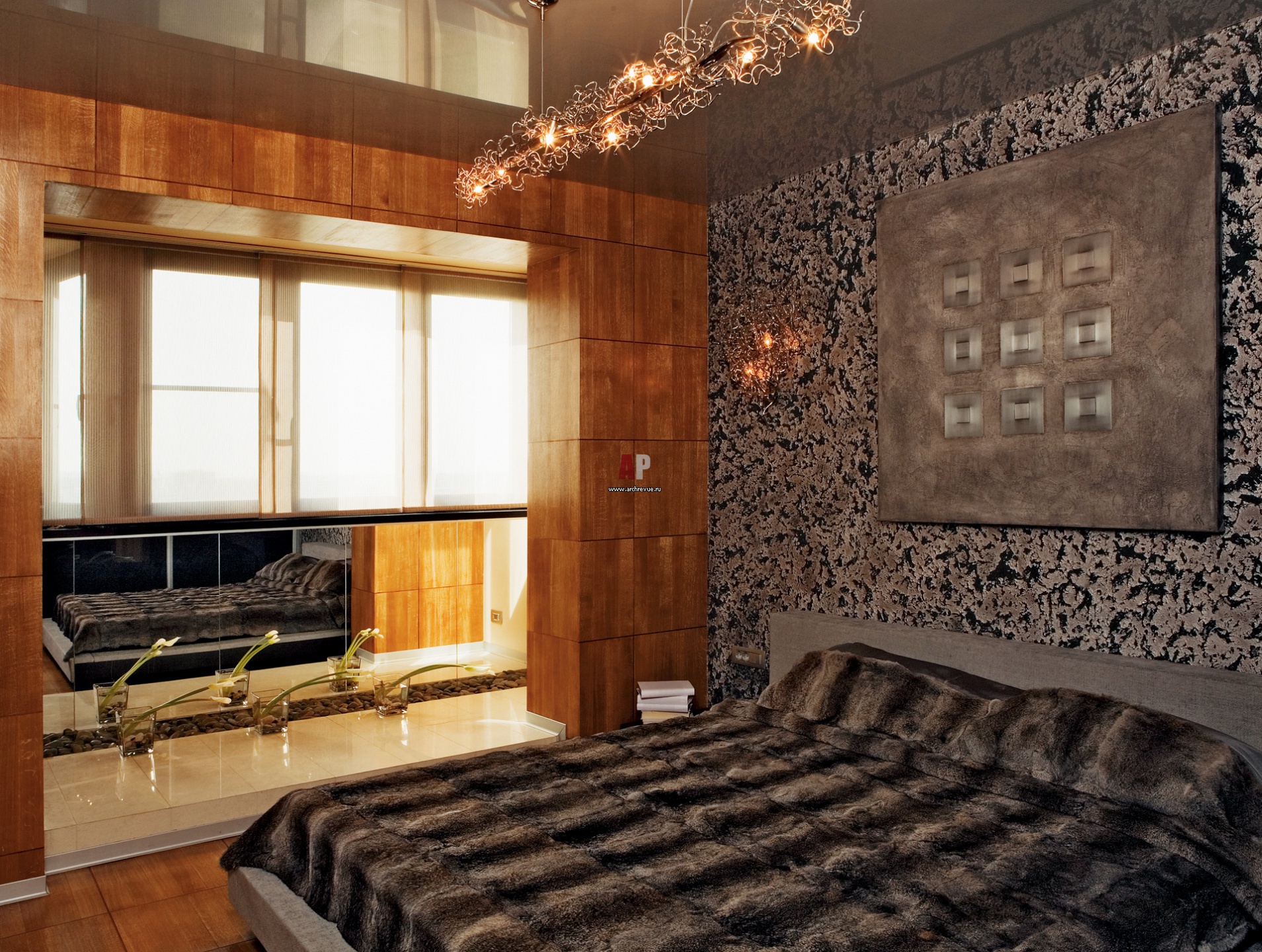 Спальня в современном стиле. Панели из натурального дерева гармонируют с декоративной брутальной штукатуркой с серебром. Глянцевый натяжной потолок зрительно увеличивают высоту помещения.