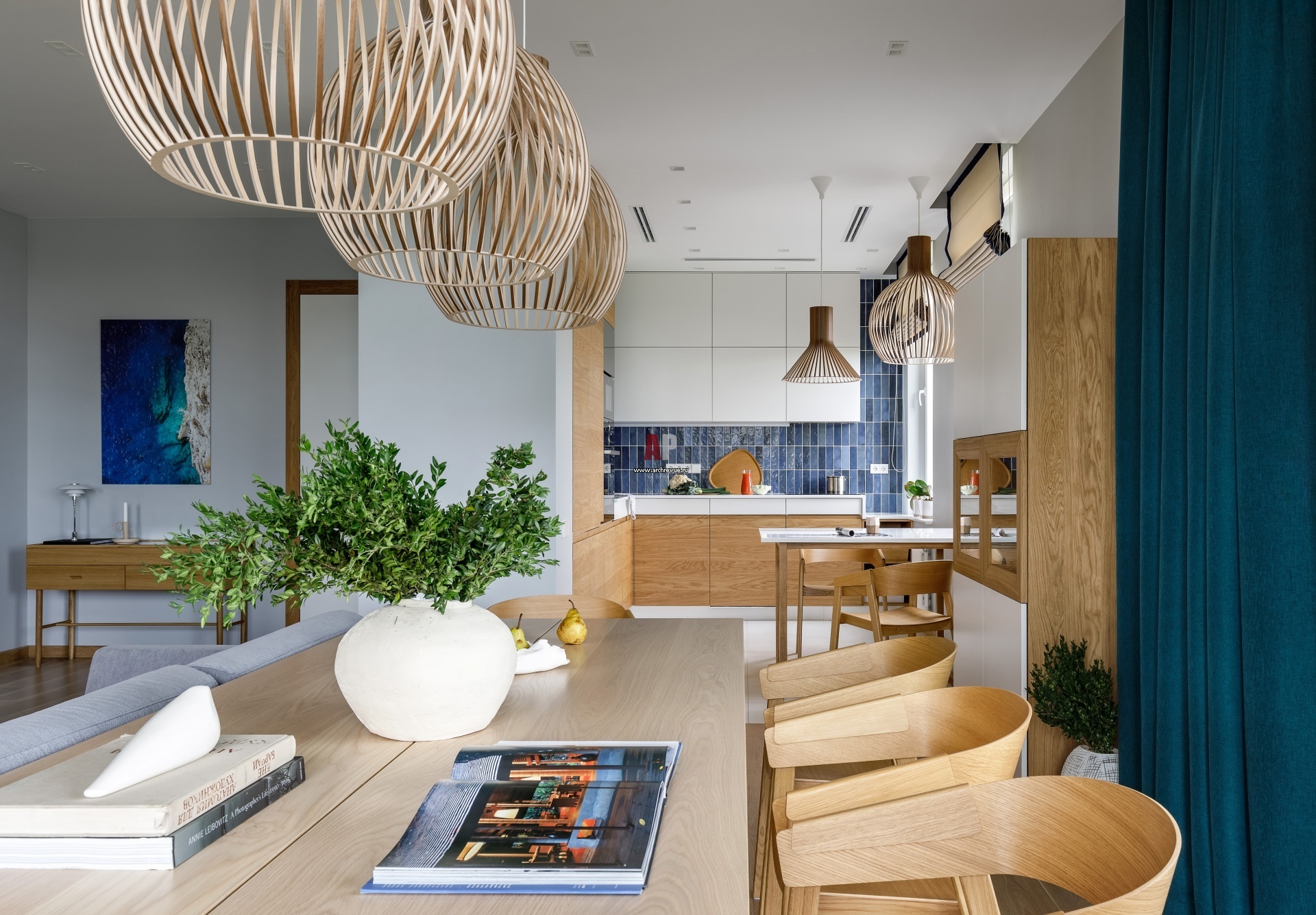 Зона кухни-столовой. Стол, BoConcept. Стулья, Muuto. Консоль-витрина, Hubsch. Над столовом – необычные светильники из березы, Secto Design.
