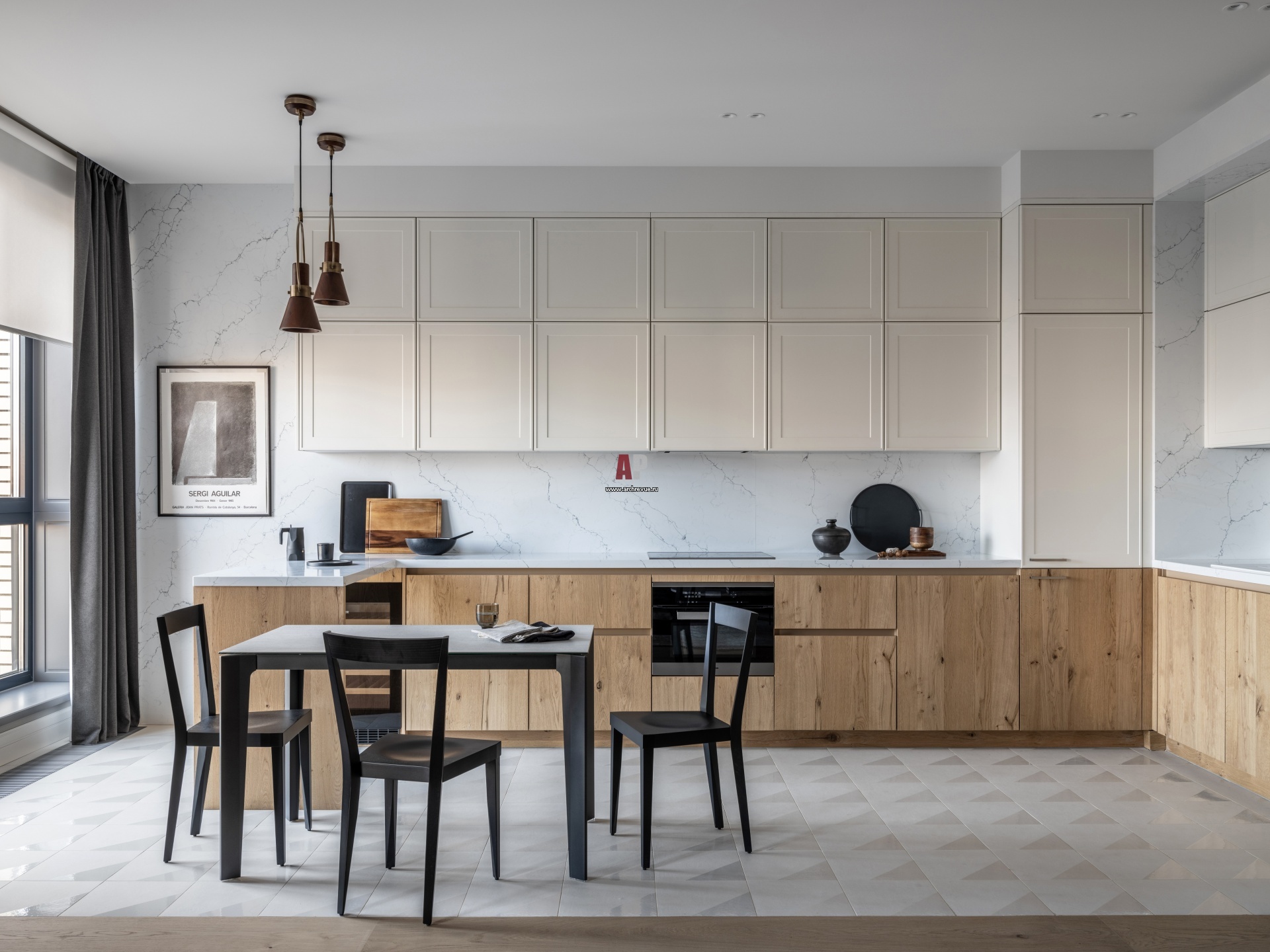 Зона кухни. Гарнитур с баром, Leicht. Дверцы нижних шкафов кухни выполнены из шпона ореха с красивым рисунком, верхних – имеют лаконичный ритмичный декор. Обеденный стол, Ozzio Italia. Стулья, Cattelan Italia (коллекция Livia). Светильники, Wood Tailors Club.