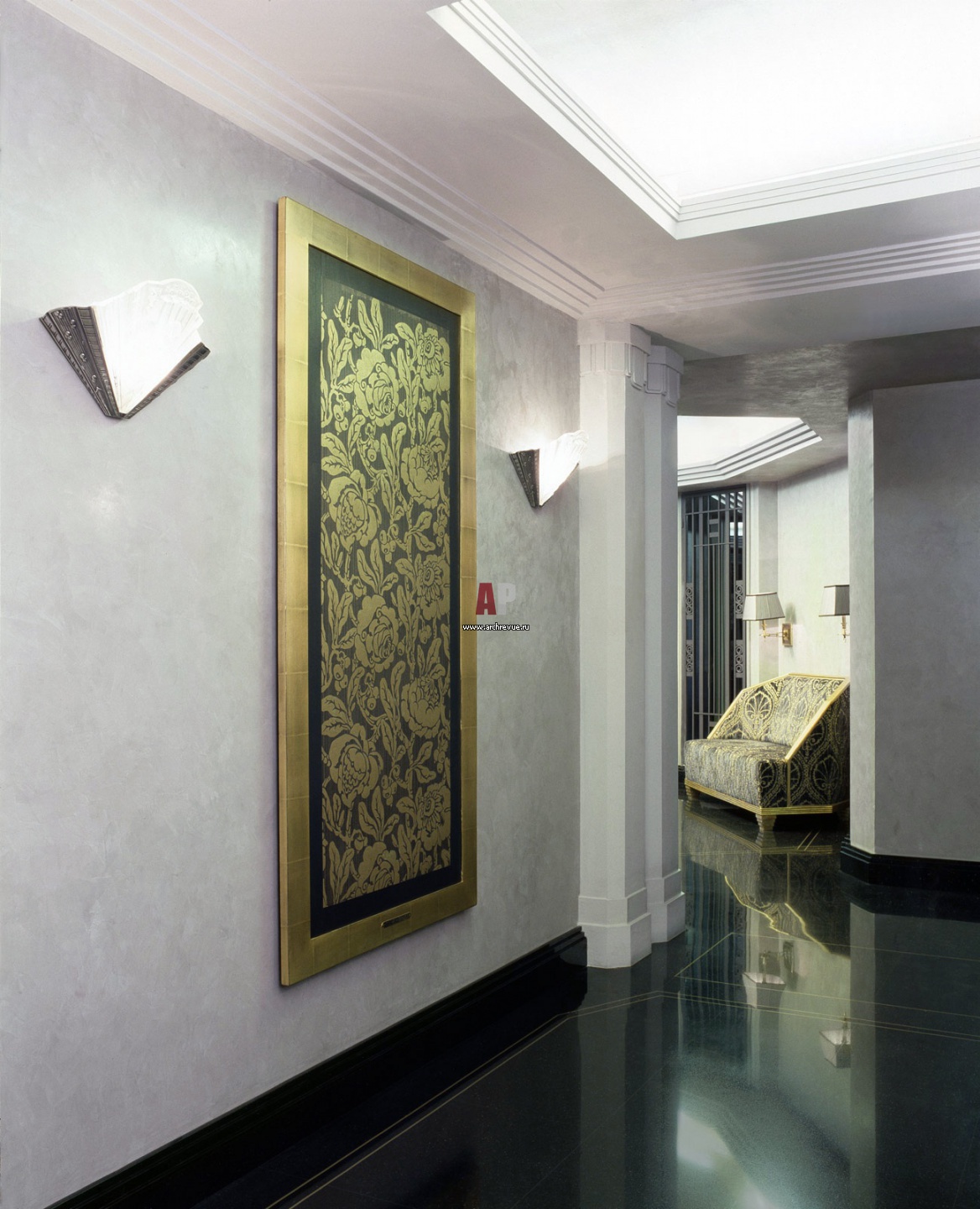Стены холла оформлены декоративной штукатуркой с перламутром. Бра, Lambert. Франция, 1925 год.