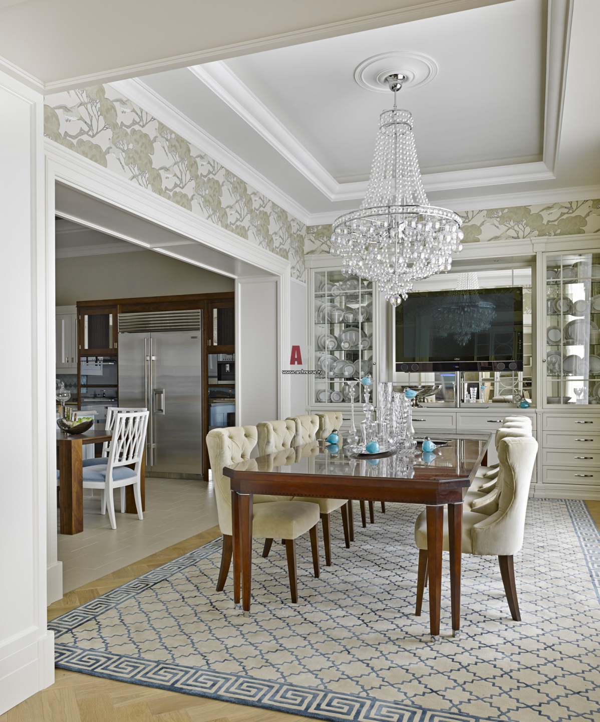 Интерьер столовой выглядит парадным и воздушным за счет белых сервантов, созданных по эскизам дизайнера, гипсовой лепнины, классической люстры Chelsom из хрусталя. Высота потолков позволила пустить широкий фриз из обоев Mulberry Home. На зеркальной стене размещен экран Metz – официальный дистрибьютор A&T Trade.