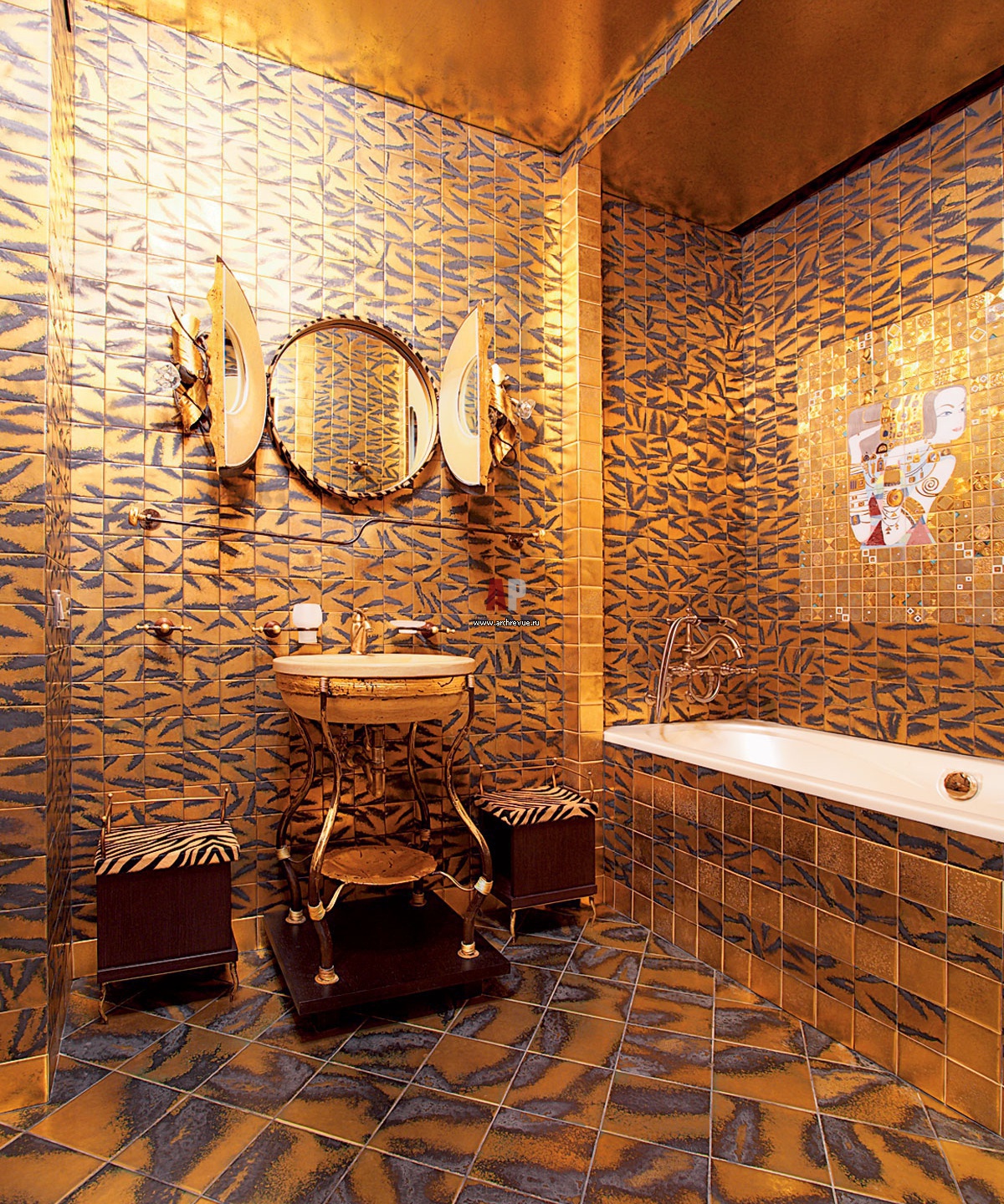 Каждый из 8 санузлов дома выглядит ярко и необычно. Все вместе они вполне могли бы стать иллюстрацией к истории развития стиля ар-деко. Тон в них задает оригинальная сантехника, поставщик «Танит».