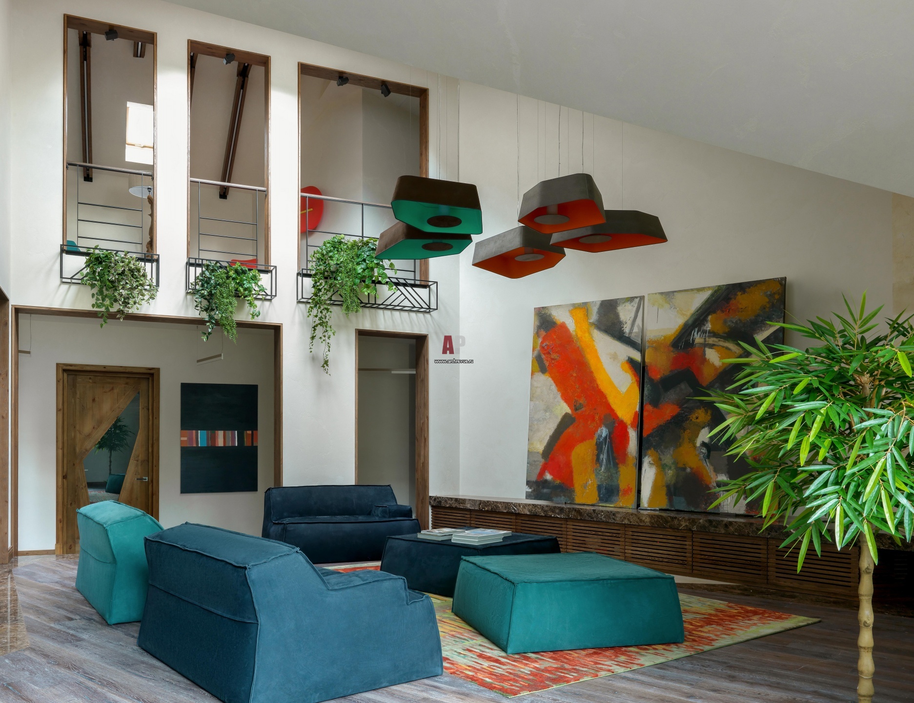 Диванная группа в гостиной со вторым светом и видом на балкон второго этажа. Фальш-окна второго этажа оформлены металлическими кашпо для растений, а сам интерьер поминает тихий двор южного городка.