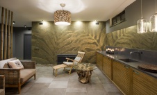 Так как баня строится, чтобы попариться, а после отдохнуть с друзьями и близкими за горячим самоваром, важно предусмотреть и дополнительные помещения, где можно восстановить силы после расслабления в парной. Дизайн их также немаловажен. Какими могут быть современные интерьеры бань и саун фото демонстрируют идеально. К примеру, если раздевалка имеет достаточную площадь, там можно разместить столик и мягкую мебель с деревянными элементами. На стене будут уместны полочка и зеркало.