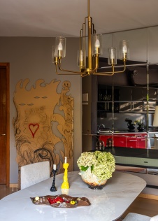 Наборной паркетный пол, круглый обеденный стол под золотистой скатертью, добротные стулья в чехлах из той же ткани великолепно представляют классический стиль в оформлении небольшого кухонного пространства. Неизгладимое впечатление производит и роскошное полотно знаменитого художника в золотой раме на стене. Высокий проем, окаймленный легкими полуколоннами по бокам, отделяет обеденную зону от остального пространства помещения.