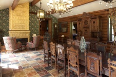 В предбаннике и парилке разбавить этот материал можно за счет использования кованых элементов печи и аксессуаров в виде вешалок для полотенец. В столовой дерево будет находиться в исключительной гармонии с фарфоровой посудой, расписанной под гжель, в комнатах для отдыха – с плотных текстилем на абажурах прикроватных светильников и гобеленами, которые применяются в качестве гардин на окнах.