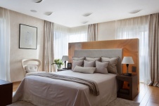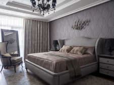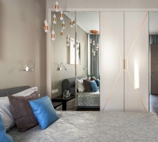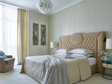 Всегда режиссирую свет: от входа включаем освещение нескольких камерных зон, у кровати выключаем. Люблю разнообразие – верхний свет, торшер, настольные лампы у кровати. Кстати, читать под ними не удобно, независимо от их высоты. Поэтому всегда устанавливаю бра над кроватью, причем вешаю его на определенной высоте – 140-150 см от пола, в зависимости от высоты спинки кровати и роста заказчика.
