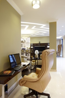 Традиционный подход к обустройству помещений рабочих зон предусматривает использование сдержанной палитры цветов. Обычно специалисты отдают предпочтение пастельной гамме – это могут быть молочные, кремовые и песочные тона, однако в некоторых случаях они заменяются насыщенным оливковым оттенком, придающим обстановке более презентабельный вид. Дополняется такая обстановка деталями, выполненными в коричневой колористике, что соответствует классическому подходу к созданию стильного интерьера кабинета.