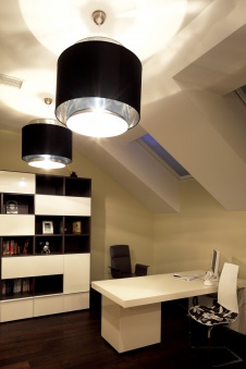 Для того чтобы обеспечить качественное освещение рабочей зоны, декораторы предпочитают использовать разнородный свет. Безусловно, особенности подобной комнаты предполагают наличие больших окон, однако для удобного времяпрепровождения здесь вечером требуются дополнительные источники света. Обычно они представляют собой настольные лампы, а также точечные светильники по всему периметру потолка. В некоторых случаях интерьер рабочего кабинета, фото которого указывает на такие особенности, дополняется люстрой.