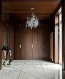 Правильно разделить это пространство на прихожую и холл, откуда расходятся все пути передвижения в интерьере. Я советую предусмотреть так же не один, а два гардеробных отсека – один сезонный и видовой, являющийся частью интерьера, другой – технический. В нем можно хранить остальную одежду.
