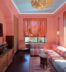 Зачастую в оформлении такой комнаты используются пастельные, теплые тона. Это может быть персиковый, оранжевый, коричневый, красный цвет. Цветовые решения должны положительно влиять на психологическое состояние людей. Стены могут отделываться тканевыми или бумажными обоями, потолок зачастую низкий, украшенный лепниной. Как и дизайн интерьера кухни фото которого можно просмотреть на сайте, оформление кальянной предполагает, что в качестве настила пола может использоваться мрамор, деревянный паркет.