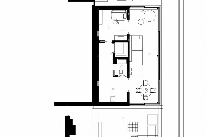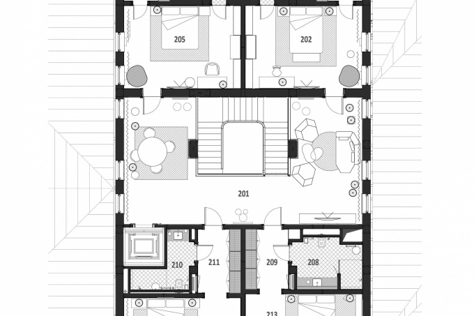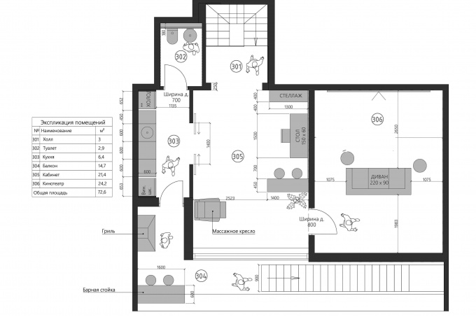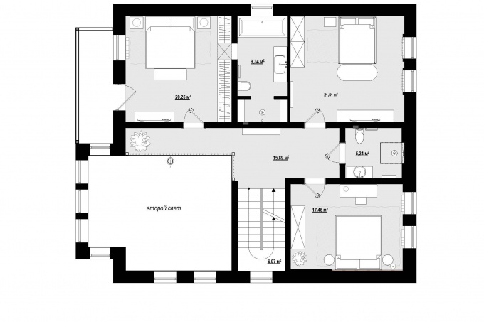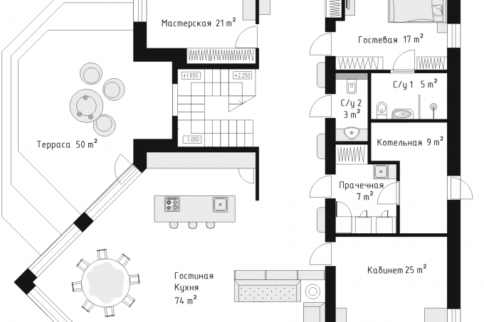 К работе над проектом дизайнеры подключились на стадии бетонной «коробки». В ходе обследования здания были обнаружены ошибки в проектировании лестницы и террасы второго этажа, а также существенные недостатки в планировочном решении. Они скорректировали недочеты и воплотили оптимальные инженерные решения: отопление, систему вентиляции, умный дом.