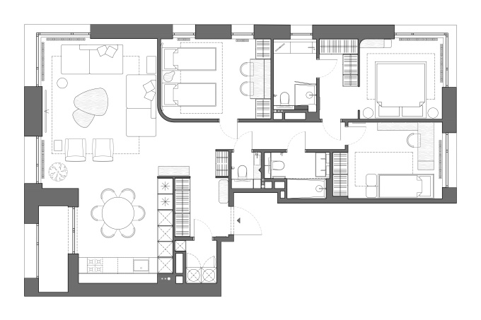 Перед дизайнерами бюро Daschamay Interiors была поставлена непростая задача: создать атмосферный и одновременно максимально практичный проект для большой семьи с тремя детьми. «Здесь у нас не было права на ошибку – каждый квадратный метр должен был работать на основную идею. Рациональное использование небольшой площади, грамотное зонирование, большое количество систем хранения – все это следовало сочетать с продуманной эстеткой. Хозяева – энергичная молодая семья – люди с большой насмотренностью, открытые к современным свежим идеям, нас во всем поддерживали. Когда мы впервые вошли в квартиру, нас впечатлило большое, залитое естественным светом пространство и великолепные виды на заповедную зону», - рассказывают дизайнеры. Эти элементы стали отправной точкой для разработки концепции уютного семейного интерьера с акцентом на природных текстурах и естественном солнечном освещении, который наполняет пространство внутренним свечением.