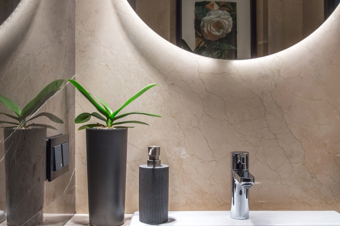 Выбранные материалы должны быть долговечными, не маркими и простыми в эксплуатации, поэтому не желательно использовать здесь светлые тона и обычную покраску. Лучше использовать мрамор и древесину влагоустойчивых пород.