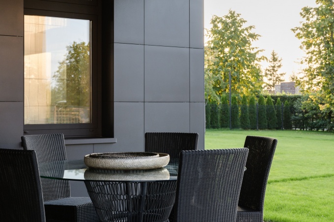 Поэтому работа над проектом началась с кардинального изменения внешнего облика дома: строгую архитектуру здания дизайнер подчеркнула с помощью деревянных реечных панелей и темного камня. В ходе работ была заменена кровля, а на части крыши создана открытая уличная терраса с зоной солярия, мини-кухней и душевой. «Первоначально заказчики планировали отремонтировать дом и продать, но результат настолько им понравился, что сейчас они живут в нем сами», - рассказывает автор проекта.