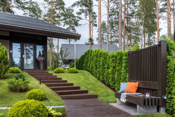 Особенность данного участка в том, что он примыкает к лесной полосе. Чтобы создать ощущение максимально приватного проживания, архитектор спроектировал дом так, что три его стороны обращены к чаще. «А при таком раскладе природный ландшафт становится полноправным участником интерьера, и наша задача ему просто не мешать», - отмечает автор проекта.