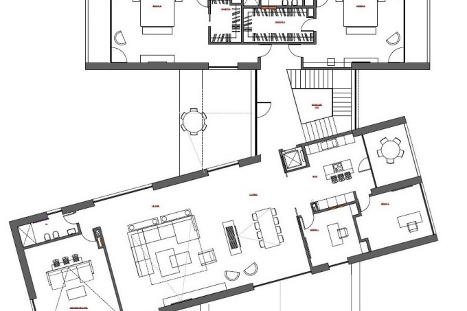 Так появилась эффектная композиция, набранная из трех объемов: нижнего и двух нависающих над ним верхних. В плане они немного завернуты и образуют приватную террасу во внутреннем пространстве, закрытую деревянными перголами. Вертикальные рейки повернуты под определенным углом так, чтобы свет проникал сквозь них, но из окон соседей не просматривалось происходящее на террасе. «Что касается планировки, то мы приняли решение поднять все основные помещения на второй этаж, чтобы создалось впечатление, что дом находится где-то на холме и из окон открывается прекрасный вид», - рассказывает архитектор Александра Федорова.