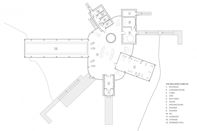Поскольку следовало учитывать рельеф местности и максимально сохранить существующую растительность, главным принципом работы архитекторов было «не навреди». Так возникла сложная композиция из четырех основных домов: хозяйского, гостевого, спа-комплекса и павильона охраны, которые связаны между собой кровлями, мостами и переходами. Здания возведены из клееного бруса, в отделке фасадов использованы панели из цинк-титана и меди.