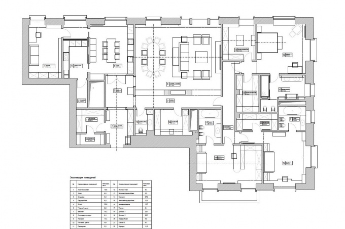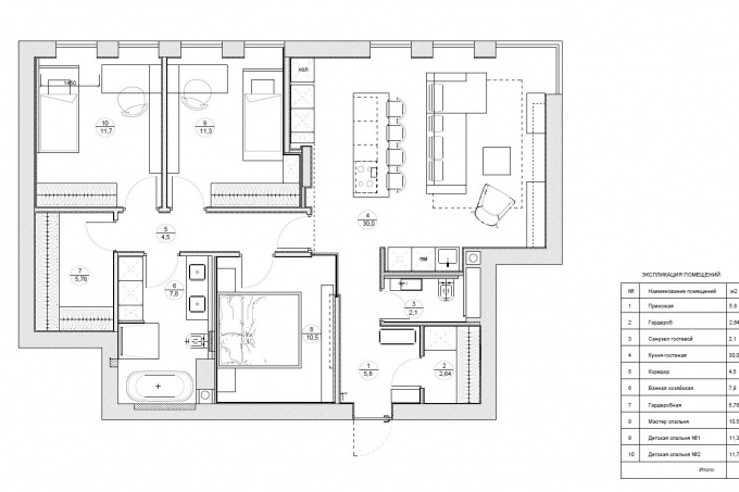 Техническое задание включало необходимость создать современное жилье для двоих и на 85 кв. м разместить общую гостиную-кухню, хозяйскую спальню, кабинет, гардеробные и два санузла. Чтобы это осуществить, дизайнеру пришлось сделать полную перепланировку: исходный план со смежными комнатами сегодня устарел и совершенно не соответствовал современным представлениям о комфорте.