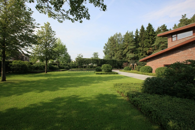 Облик этого сада, расположившегося на 2 гектарах земли, тесно связан с архитектурой дома, который построен в современной стилистике и отличается простотой и строгостью линий.