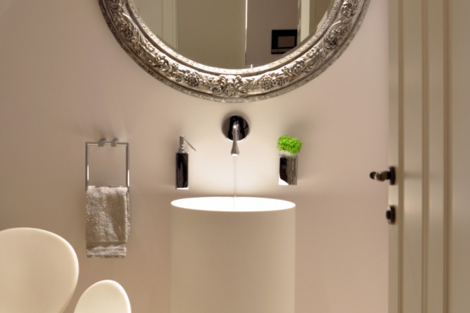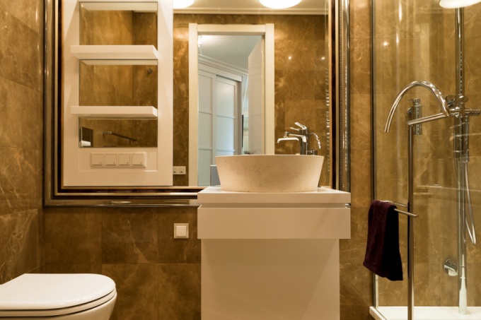 Выбранные материалы должны быть долговечными, не маркими и простыми в эксплуатации, поэтому не желательно использовать здесь светлые тона и обычную покраску. Лучше использовать мрамор и древесину влагоустойчивых пород.
