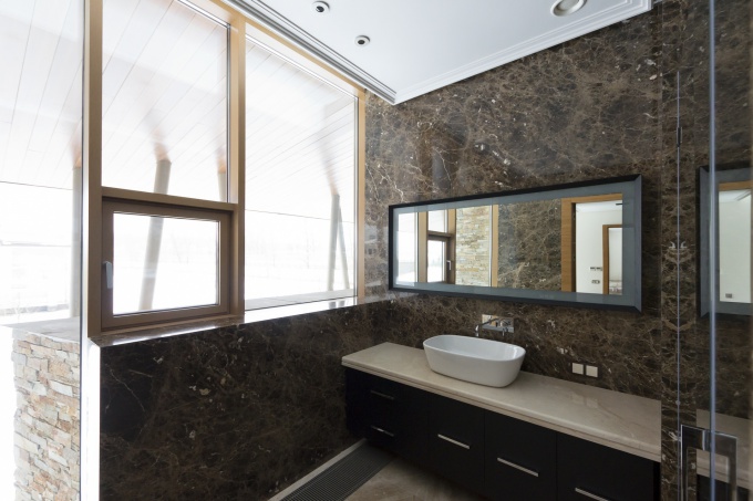 Выбранные материалы должны быть долговечными, не маркими и простыми в эксплуатации, поэтому не желательно использовать здесь светлые тона и обычную покраску. Лучше использовать мрамор и древесину влагоустойчивых пород.
