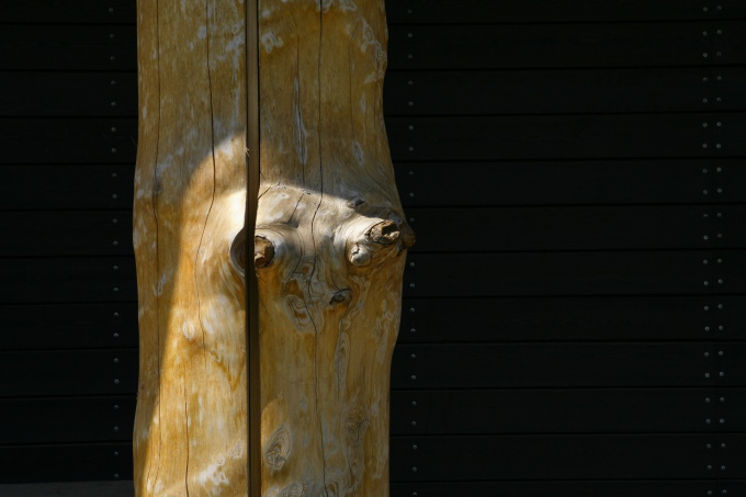Благодаря тому, что здание вытянуто по ландшафту (длина двухчастного объема составляет 61 метр), трехэтажная постройка воспринимается как одноуровневое строение. Панорамные окна дома размещены так, что изнутри они открывают вид на участок, а снаружи в них невозможно заглянуть. Вдоль окон идет опоясывающая галерея с вывесами кровли.