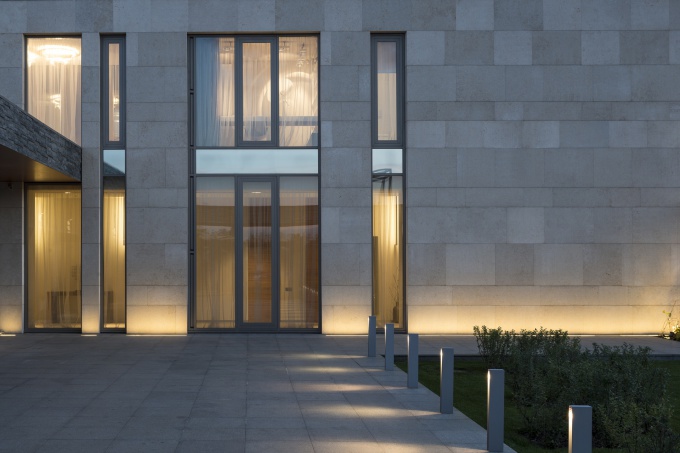 Ее визуальная фишка – большое круглое отверстие, сквозь которое прорастает высокая сосна. Крона дерева отбрасывает на стены и полы веранды живописные тени, по которым, как по солнечным часам, можно определять суточное время. Вытянутый модернистский дом выглядит элегантно и рафинированно еще и за счет отделки основного объема светло-бежевым юрским мрамором, а гаража узкой плиткой из сланца цвета стали, которые еще лучше работают на фоне зеленого ландшафта.