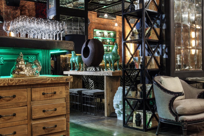Расположилось заведение на месте восточного ресторана «Килим», от которого оно унаследовало кирпичные стены, деревянные ширмы-панели, арочные зеркальные потолки, открытые коммуникации и значительную часть мебели. Поэтому работать над образом запоминающегося, комфортного и остроумного заведения, куда хочется возвращаться, дизайнеру пришлось исключительно декораторскими средствами. В итоге получился интерьер, аналогов которому в Москве не сыщешь, его эклектичная стилистика намеренно доведена почти до грани китча.