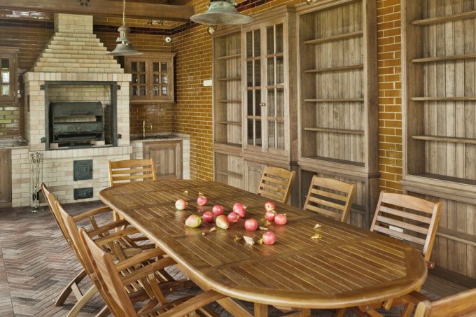 Помимо строительных и отделочных работ над интерьером основного дома, перед архитекторами была поставлена задача спроектировать и построить на участке всесезонную беседку с печью-барбекю, кухней и большим обеденным столом. Более подробно о проекте беседки можно прочитать здесь.