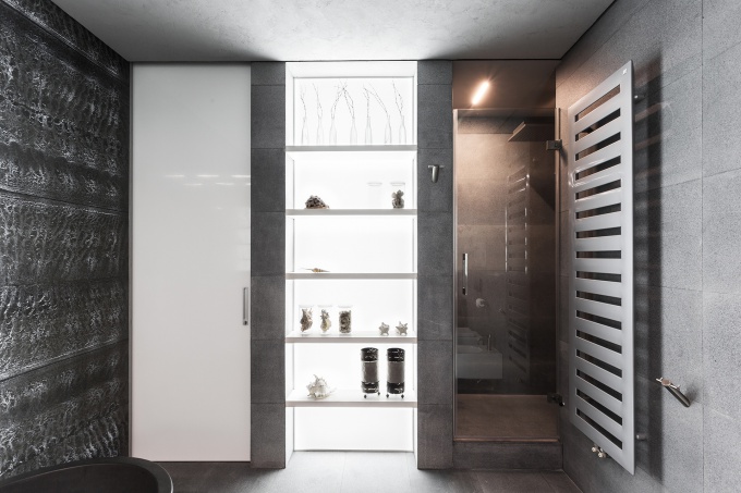 Квартира-студия для молодой девушки расположена на Остоженке. Перед автором проекта стояла задача создать современное функциональное жилье, где можно уединиться от городской суеты и в то же время весело провести время с друзьями. В качестве стилистики оформления был выбран мягкий минимализм, а основная ставка сделана на мобильные стеклянные панели и финишную отделку стен и потолка с имитацией бетона.