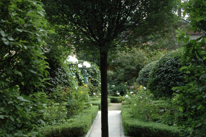 Концепция этого небольшого сада была продиктована стилистикой дома, выполненного в духе Средневековья с высоким забором из красного кирпича и массивными дубовыми воротами с металлическими накладками и мозаикой с Жар-Птицами, которые вызывают ассоциации с русской былинной культурой. За основу проекта ландшафтные дизайнеры Il Nature предложили взять вертоград, монастырский дворик-сад, который традиционно со средневековых времен разбивался при европейских монастырях.