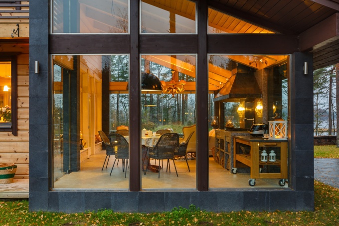 Деревянный дом, расположенный в сосновом лесу на берегу озера под Петербургом, в районе Карельского перешейка, построен по проекту архитектора Вячеслава Хомутова. Двухэтажная постройка из клееного бруса имеет панорамные окна, что обусловлено климатическими особенностями местности и коротким световым днем на северо-западе России.