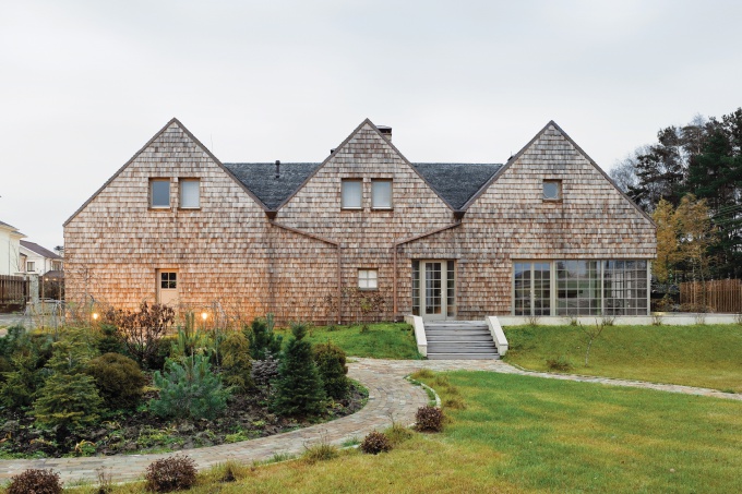 Небольшой участок площадью 15 соток расположен в живописном стародачном месте Подмосковья. Модернистский дом с черными витражами и лаконичными фасадами, облицованными серым сланцем и древесиной лиственницы, был вдохновлен его владельцем – человеком с творческой профессией. При работе над ландшафтом приверженец стиля хай-тек и инновационных технологий перед ландшафтным архитектором Владимиром Жилинским поставил задачу создать современный сад, который подчеркнул бы строгую архитектуру дома.