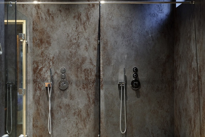 Для его оформления были выбраны исключительно натуральные материалы (мраморная и каменная мозаика, травертин, дерево, минеральные штукатурки, кожа, лен, металл), которые красиво старятся и со временем приобретают еще большой шарм.