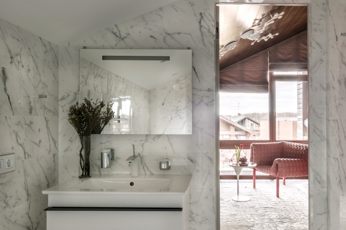 Выбранные материалы должны быть долговечными, не маркими и простыми в эксплуатации, поэтому не желательно использовать здесь светлые тона и обычную покраску. Лучше использовать мрамор и древесину влагоустойчивых пород.