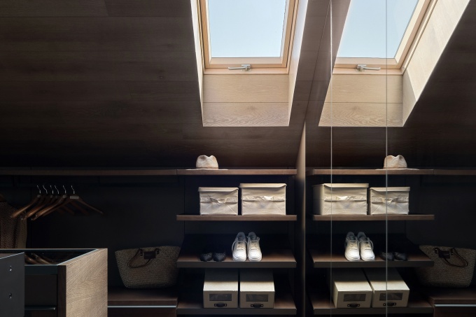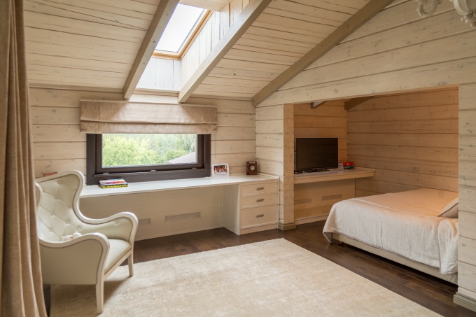 Перед началом работ строители обнаружили сильные повреждения перекрытий этажа и пола, решили все поменять, поэтому остался только несущий скелет дома, стены и пара деревянных колон. Это дало возможность сделать хорошую шумоизоляцию и заново распланировать пространство. Серьезному апгрейду подвергся фасад (полностью отшлифовали и заново покрасили брус), были увеличены в размерах окна, добавилась пергола с тентом и стеклянный балкон. В итоге дом стал выглядеть не менее колоритно, чем шале в Куршавеле.