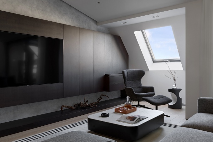 «Наклонный потолок, мансардные окна, террасы – все это красиво и интересно смотрится в интерьере, но разные высоты, а главное множество сложных узлов и примыканий представляли серьезный недостаток», – отмечает автор проекта. Поэтому работа над квартирой началась с утепления внутренних стен, остекления лоджий, усиления узлов примыкания. Мансардные деревянные окна остались от застройщика, их только покрасили по RAL в контрастный темный цвет.