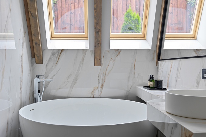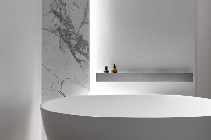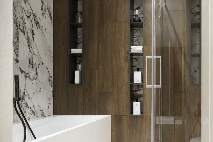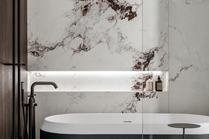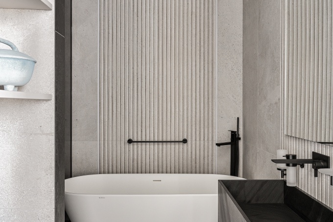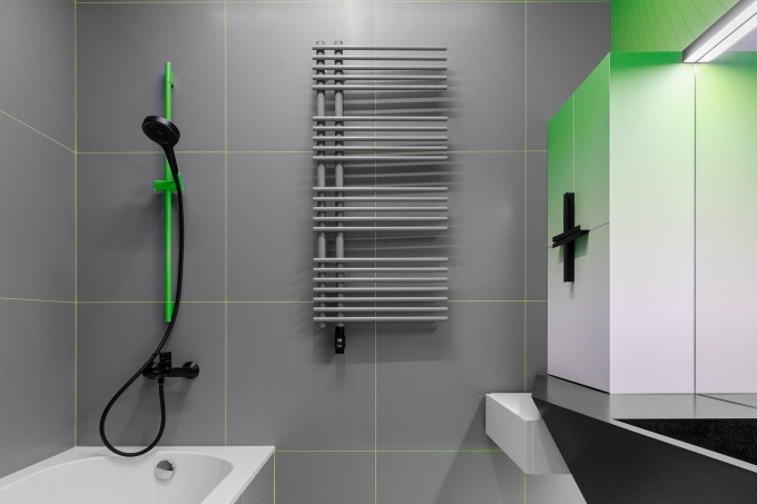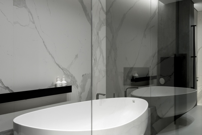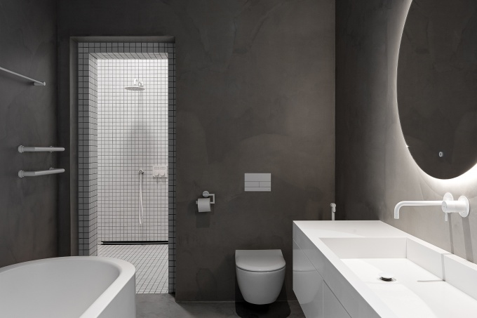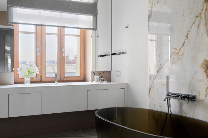 При реализации проекта она заложила актуальную техническую начинку: механическую приточно-вытяжную вентиляцию с увлажнением воздуха, телевизоры, скрытые в нише за зеркалом и черным стеклом, с вмонтированным в тумбу под ТВ дополнительным оборудованием (например, playstation), потолочную акустическую систему, умные унитазы и встроенные пылесосы.