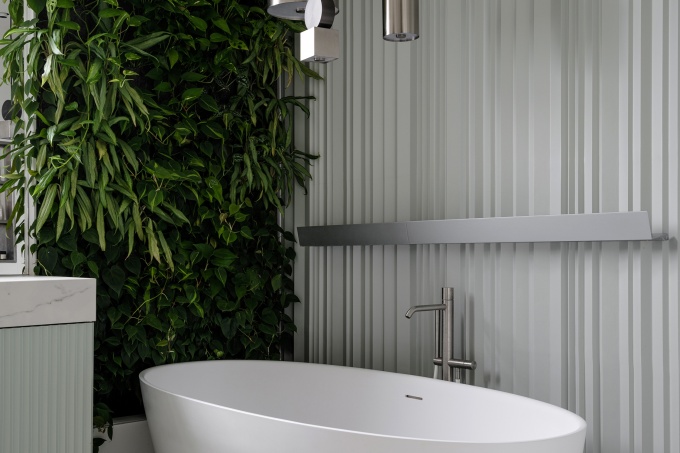 Всеми инженерными, климатическими и светозвуковыми решениями можно управлять с планшета и телефона. Особое внимание архитектор уделила оснащению вертикального сада, который функционирует автоматически, без участия человека. Он подключен к воде и канализации, капельный полив и специальный свет для растений в нужное время включает специально запрограммированный таймер.