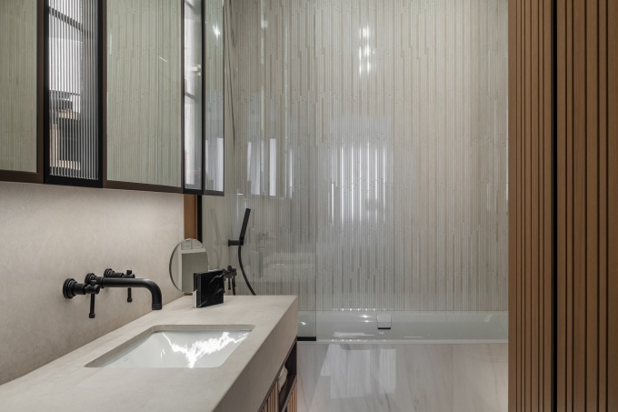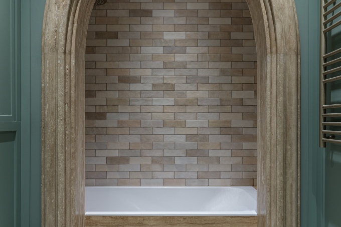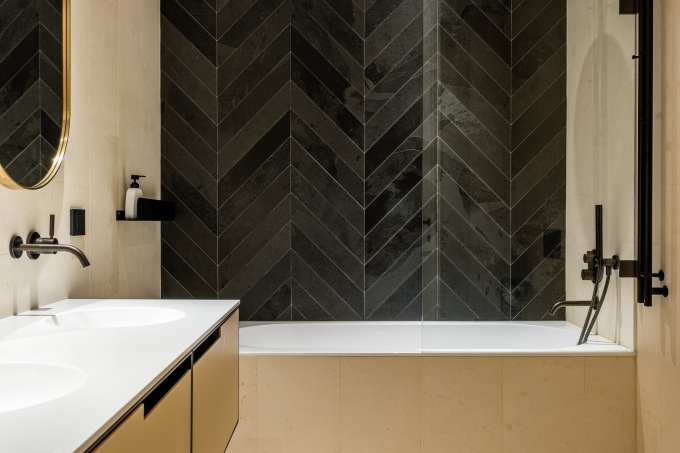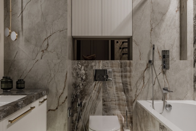 Особенность фасадов здания – исторические архитектурные приемы: арочные окна, крупный руст и «алмазная огранка» декоративных деталей. Именно они вдохновили автора на создание интерьера с необычной пластикой, деликатными рельефными орнаментами и элементами неоклассики.