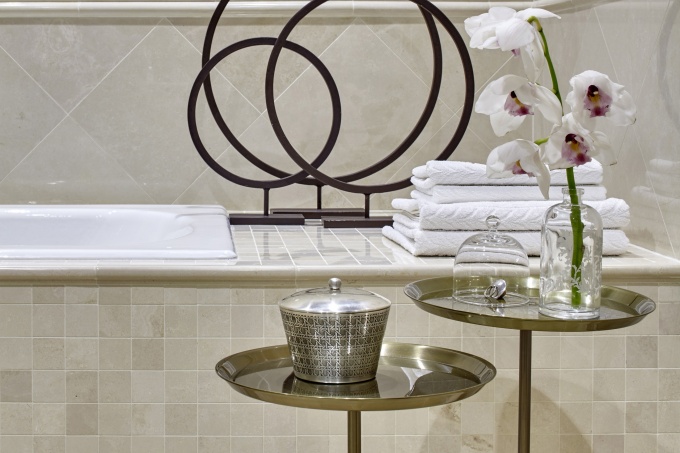 Для его оформления были выбраны исключительно натуральные материалы (мраморная и каменная мозаика, травертин, дерево, минеральные штукатурки, кожа, лен, металл), которые красиво старятся и со временем приобретают еще большой шарм.
