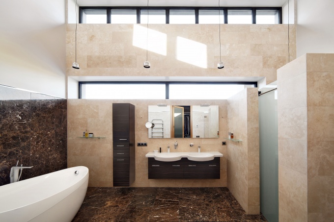 Простые формы акцентированы нетривиальной отделкой с использованием натурального камня и дерева с теплой природной текстурой. Каждый функциональный объем обозначен своим облицовочным материалом: травертином, сланцем или доской из лиственницы, центральный фасад выделен деревянными элементами, напоминающими перголу. В полной гармонии с внешним оформлением дома решены его интерьеры: ключевой идеей в дизайне стала современная природная тематика.