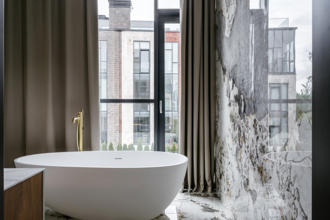 Сам дом примечателен малой этажностью, большими площадями квартир, панорамным остеклением и природным окружением в черте города. Заказчики хотели жить в гармонии с природой, находясь при этом в мегаполисе. Архитектор разработал современный интерьер, который балансирует между живописной внешней средой и минималисткой архитектурой: комфортный, эффектный, со своим визуальным кодом.