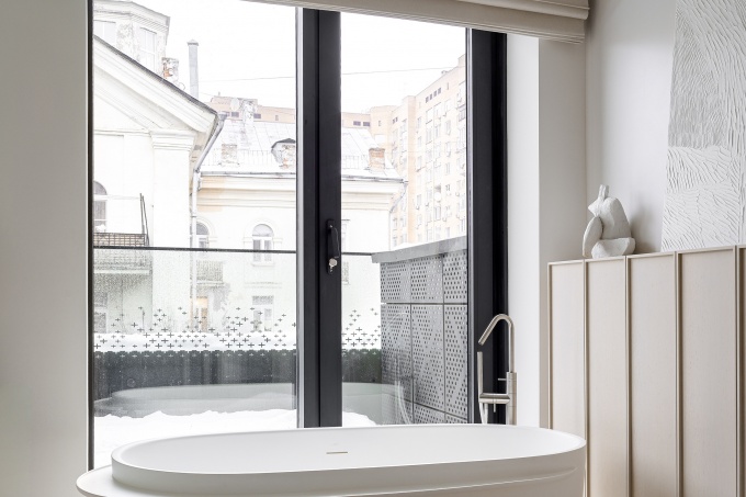 Квартира площадью 150 кв. м стала для заказчицы подарком самой себе, где ей хотелось собрать необычные предметы и декоративные приемы, которые будут вдохновлять и дарить радость. «Поэтому этот интерьер – тот редкий случай, когда в процессе работы эстетика часто брала вверх над удобным, практичным и бытовым», - рассказывают авторы проекта. Планировку квартиры разработал архитектор Александр Семенец, и дизайнеры лишь немного доработали исходный план: изменили конфигурацию главной ванной комнаты, добавили встроенные шкафы таким образом, чтобы не нарушать архитектурные оси с красивыми перспективами.