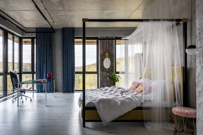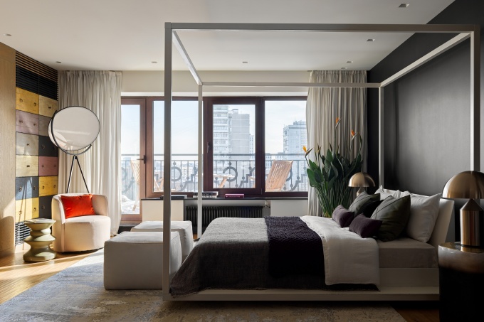 Она создала фактурный интерьер в темных тонах с элементами лофта, брутальными текстурами и акцентным авторским декором. Это насыщенное пространство эффектно контрастирует с цветом неба за окном и поддерживает урбанистическую городскую архитектуру.