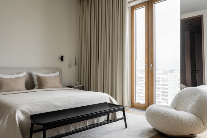 Невероятные видовые перспективы сделали главным героем этого проекта само пространство, с его уникальной пластикой, воздухом и городскими панорамами. В функциональном плане заказчики хотели рациональный интерьер, с продуманной и вместительной системой хранения и местом для размещения коллекции современного искусства. Работа над проектом шла в очень быстром темпе: на планировку, инженерный проект, подбор и закупку мебели, материалов и сами ремонтные работы ушло 10 месяцев. Что, во время пандемии и нестабильной экономической ситуации, случай почти невероятный.