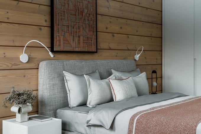 Всегда режиссирую свет: от входа включаем освещение нескольких камерных зон, у кровати выключаем. Люблю разнообразие – верхний свет, торшер, настольные лампы у кровати. Кстати, читать под ними не удобно, независимо от их высоты. Поэтому всегда устанавливаю бра над кроватью, причем вешаю его на определенной высоте – 140-150 см от пола, в зависимости от высоты спинки кровати и роста заказчика.