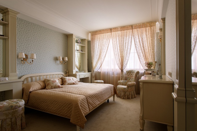 В спальне особую роль играет текстильное оформление окон. Обычно используют два вида штор. Ближние к окну – «ночные шторы». Они могут быть светонепроницаемы, тогда используют ткань black out. Можно ограничиться и плотной тканью на подкладке. У таких штор есть еще одна полезная функция – звукопоглощение.