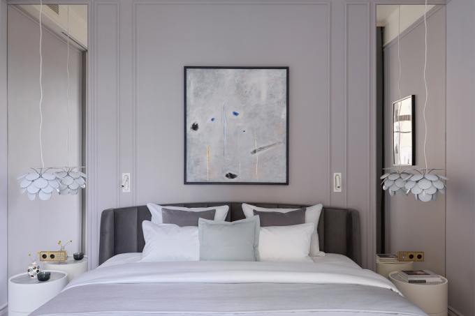 Всегда режиссирую свет: от входа включаем освещение нескольких камерных зон, у кровати выключаем. Люблю разнообразие – верхний свет, торшер, настольные лампы у кровати. Кстати, читать под ними не удобно, независимо от их высоты. Поэтому всегда устанавливаю бра над кроватью, причем вешаю его на определенной высоте – 140-150 см от пола, в зависимости от высоты спинки кровати и роста заказчика.
